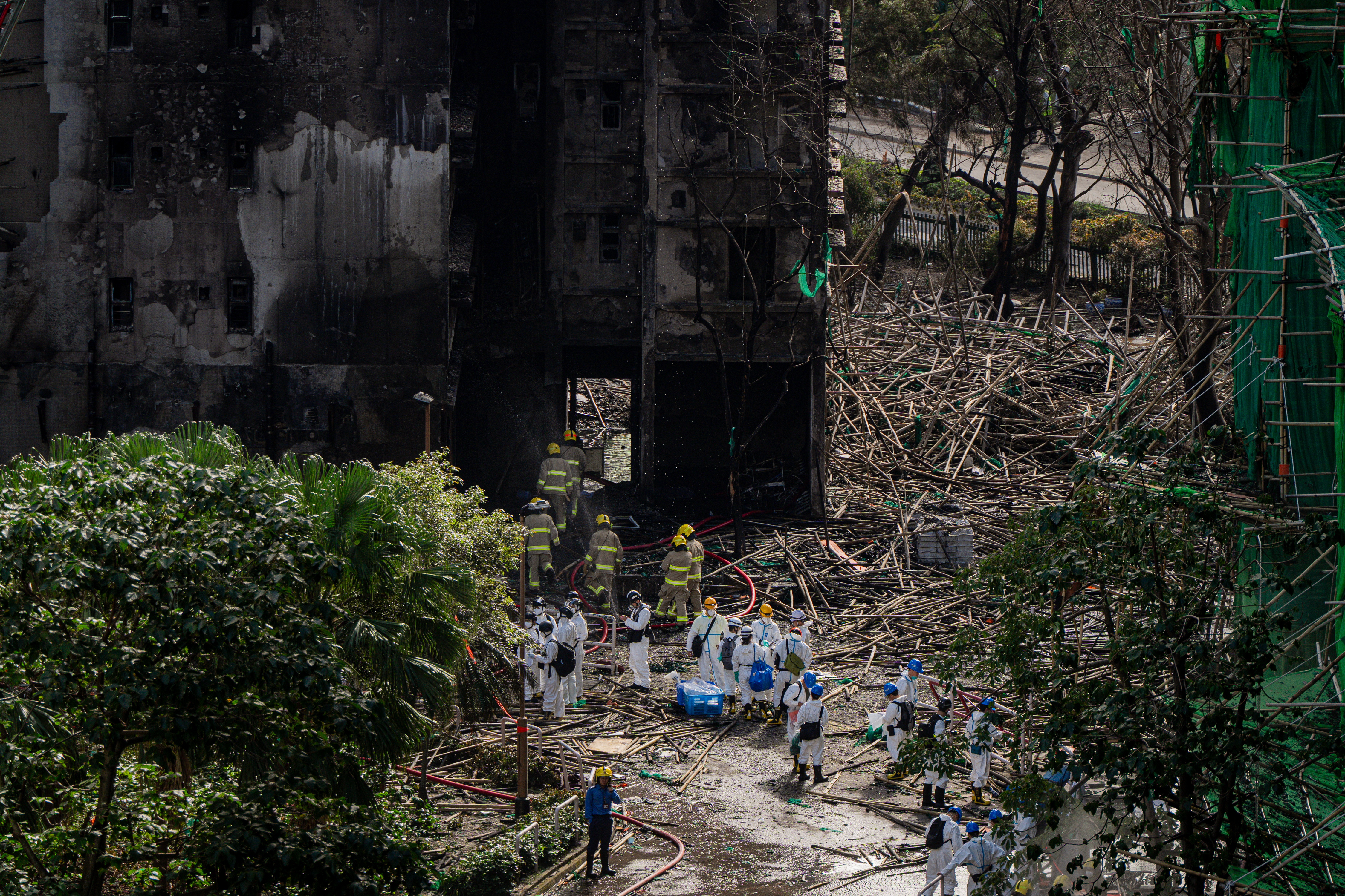 2025年11月29日,香港大埔宏福苑火灾,身穿防护服的香港警方进入过火大楼开展巡查搜证工作。图源IC