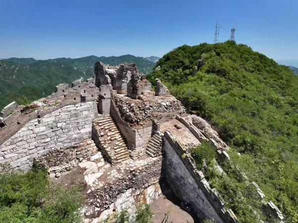 箭扣长城东段(117号敌台—122号敌台及117号—122号敌台间边墙)保护修缮项目位于怀柔区雁栖镇西栅子村南山脊上。本次修缮段东起“牛犄角边”山顶的117号敌台,逶迤向西,至“正北楼”(122号敌台)止,包括117、118、119、120、121号敌台5座以及敌台间长城墙体。