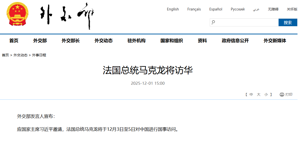 应国家主席习近平邀请,法国总统马克龙将于12月3日至5日对中国进行国事访问。