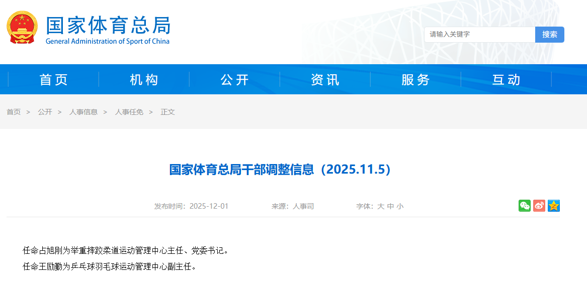 新京报讯 据国家体育总局网站消息,国家体育总局干部调整信息(2025.11.5):