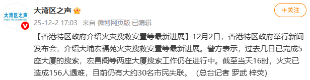 据大湾区之声消息,12月2日,香港特区政府举行新闻发布会,介绍大埔宏福苑火灾搜救安置等最新进展。警方表示,过去几日已完成5座大厦的搜索,宏昌阁等两座大厦搜索工作仍在进行中。截至当天16时,火灾已造成156人遇难,目前仍有大约30名市民失联。(总台记者 罗武 梓荧)