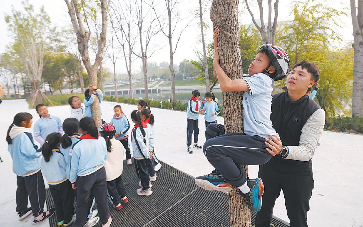 11月下旬,天气渐冷,北京即将步入冬季。在凉水河畔的“乐学公园”内,“爬树”这堂开设在大自然中的体育课,让北京市丰台外国语学校的学生们玩得不亦乐乎。