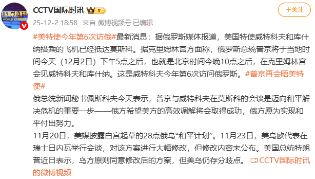 据CCTV国际时讯消息,据俄罗斯媒体报道,美国特使威特科夫和库什纳搭乘的飞机已经抵达莫斯科。据克里姆林宫方面称,俄罗斯总统普京将于当地时间今天(12月2日)下午5点之后,也就是北京时间今晚10点之后,在克里姆林宫会见威特科夫和库什纳。这是威特科夫今年第6次访问俄罗斯。
