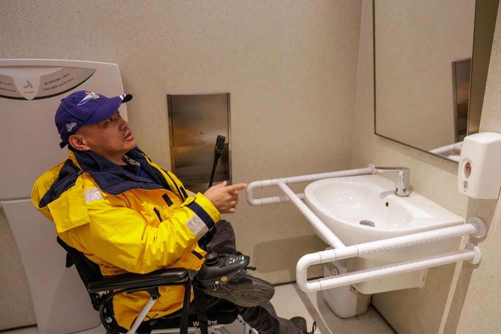 12月1日,张屹体验了通州万象汇顶层电影院的无障碍厕所,该厕所并未设置有设计规范要求的多功能台和低位挂衣钩,这会给残障人士解决生理问题时带来困难。