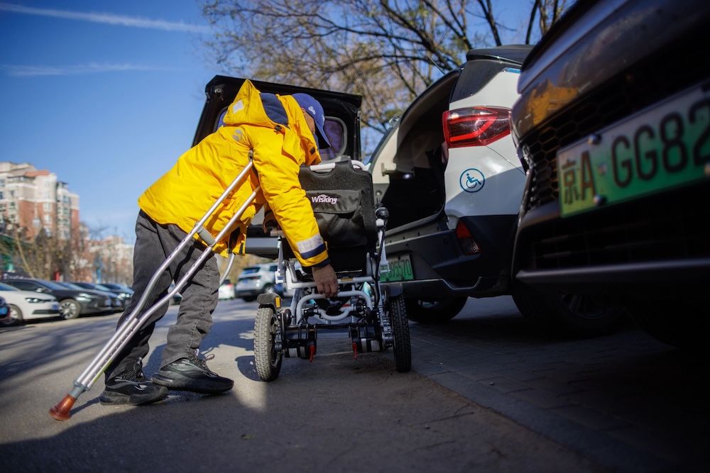 12月1日,张屹将电动轮椅放进车的后备厢准备出发,车辆后部张贴了无障碍标识。