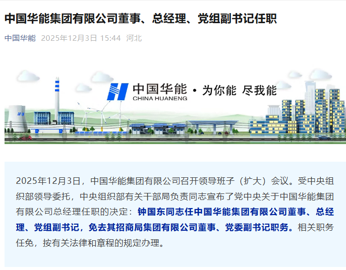 新京报讯 据中国华能微信公众号消息,2025年12月3日,中国华能集团有限公司召开领导班子(扩大)会议。受中央组织部领导委托,中央组织部有关干部局负责同志宣布了党中央关于中国华能集团有限公司总经理任职的决定:钟国东同志任中国华能集团有限公司董事、总经理、党组副书记,免去其招商局集团有限公司董事、党委副书记职务。相关职务任免,按有关法律和章程的规定办理。