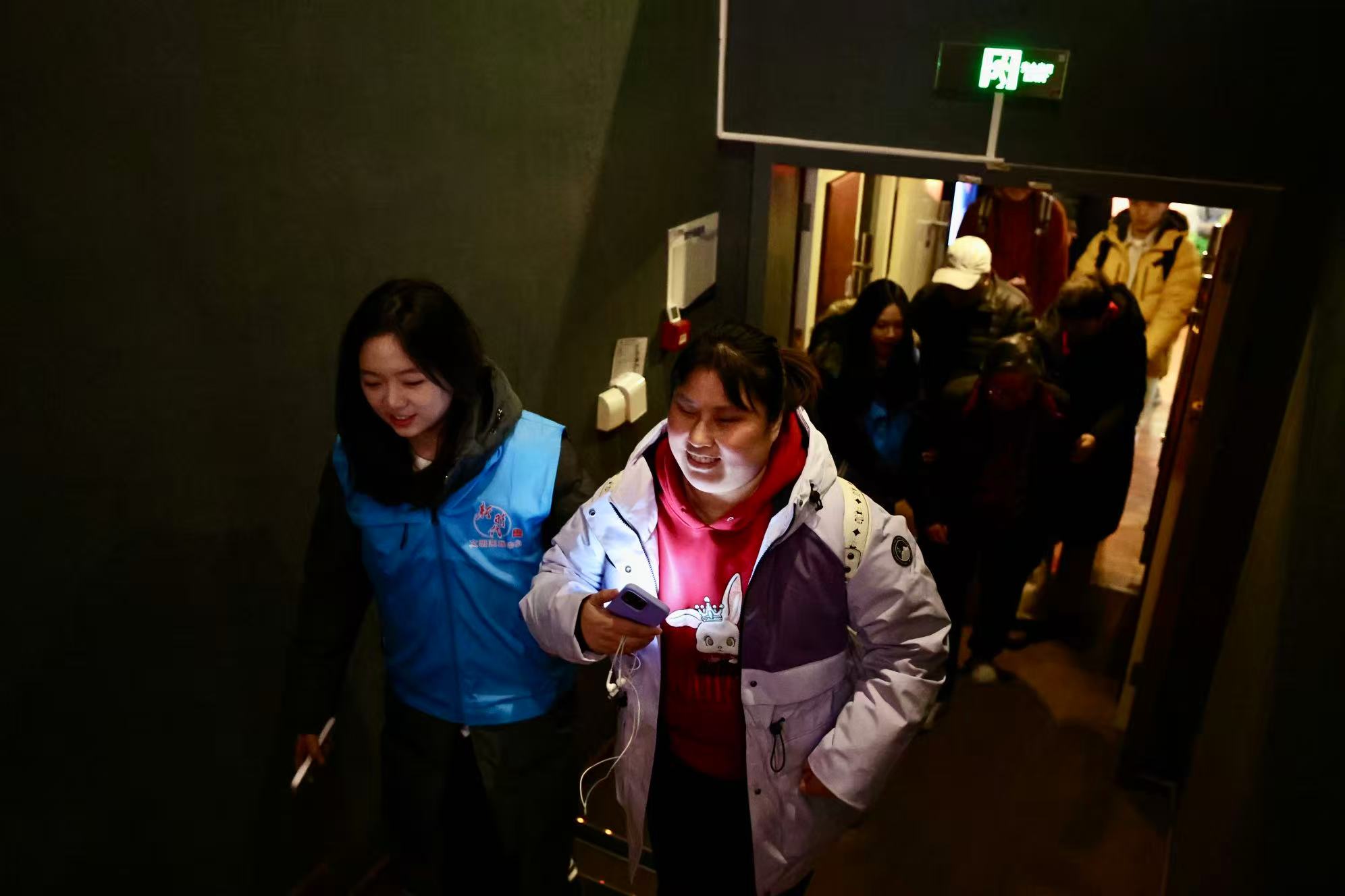 12月1日,中国传媒大学的学生志愿者带着石玉走进影院。新京报记者 王飞 摄