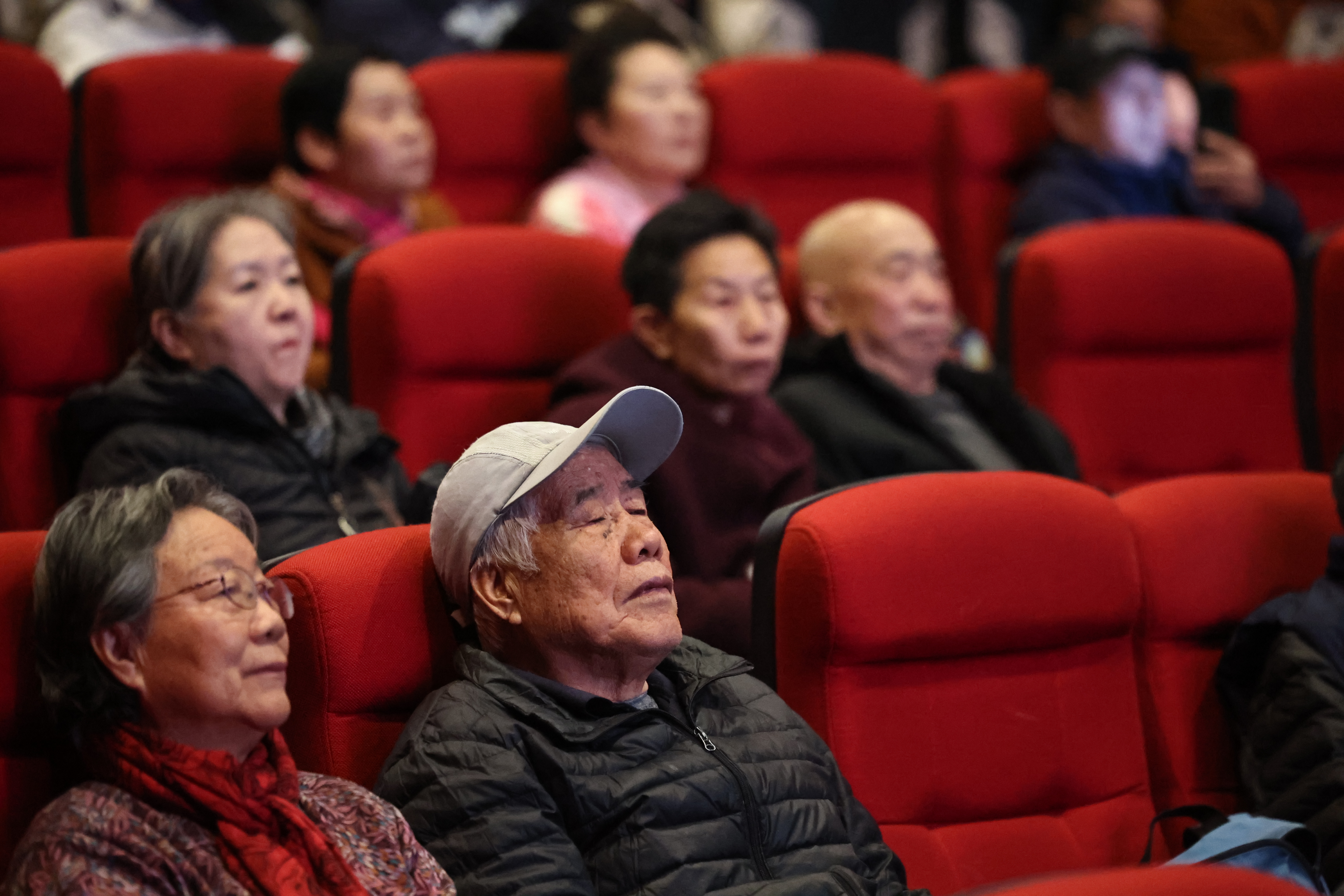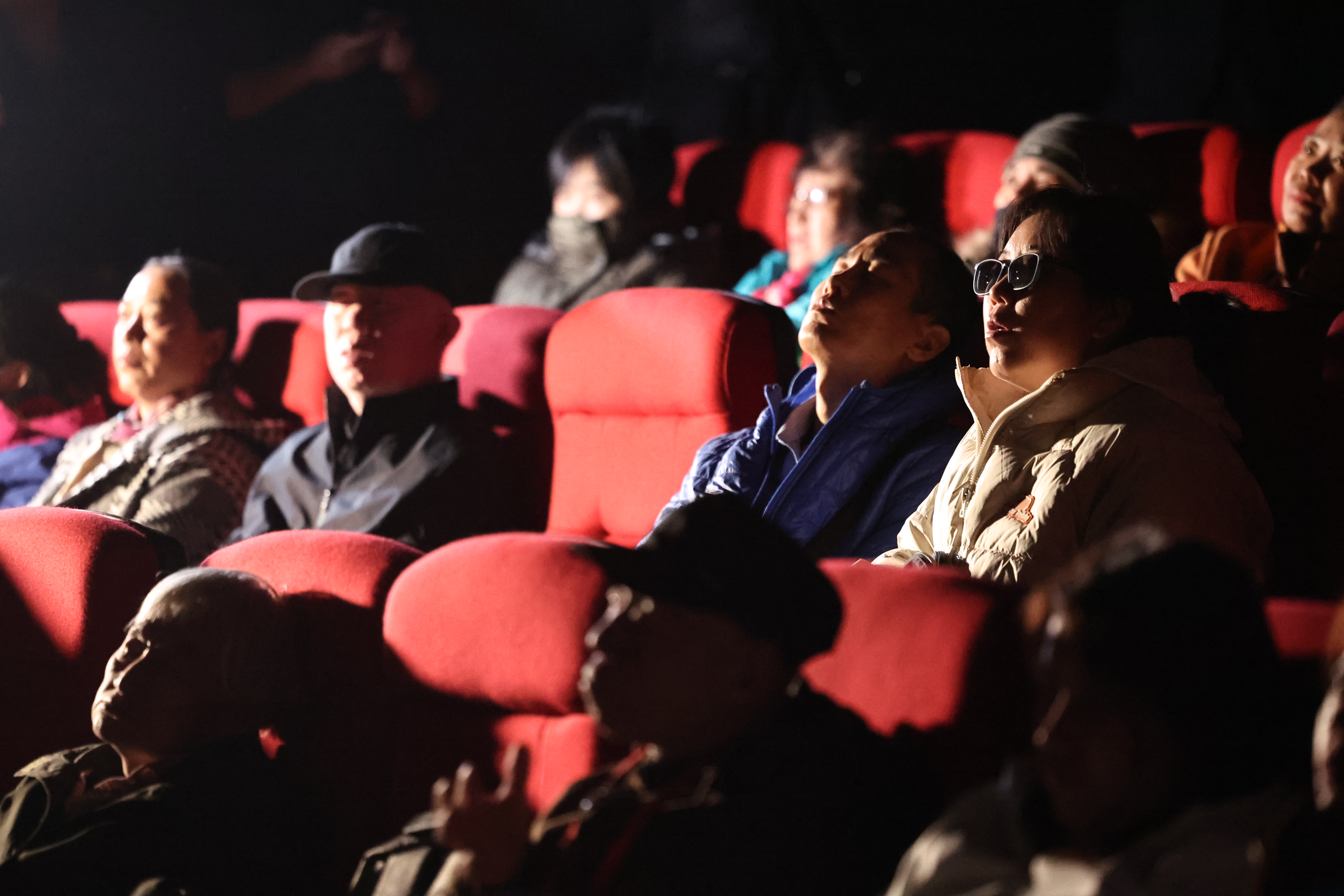 12月1日,黄新民和老伴儿坐在影院内,等待电影开场。新京报记者 王飞 摄