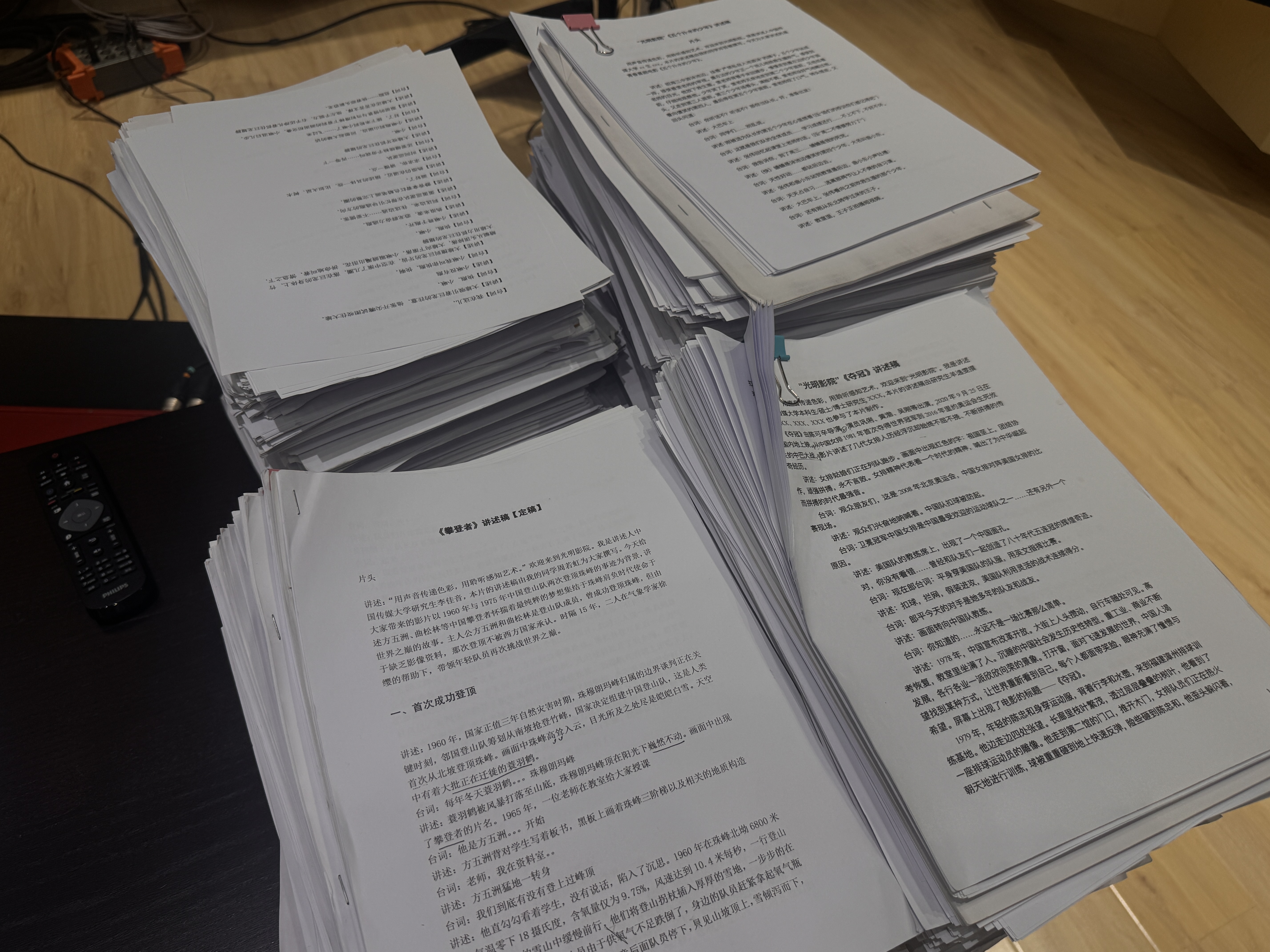 中国传媒大学“光明影院”的录制室内,讲述词在桌前堆成小山。新京报记者 熊丽欣 摄