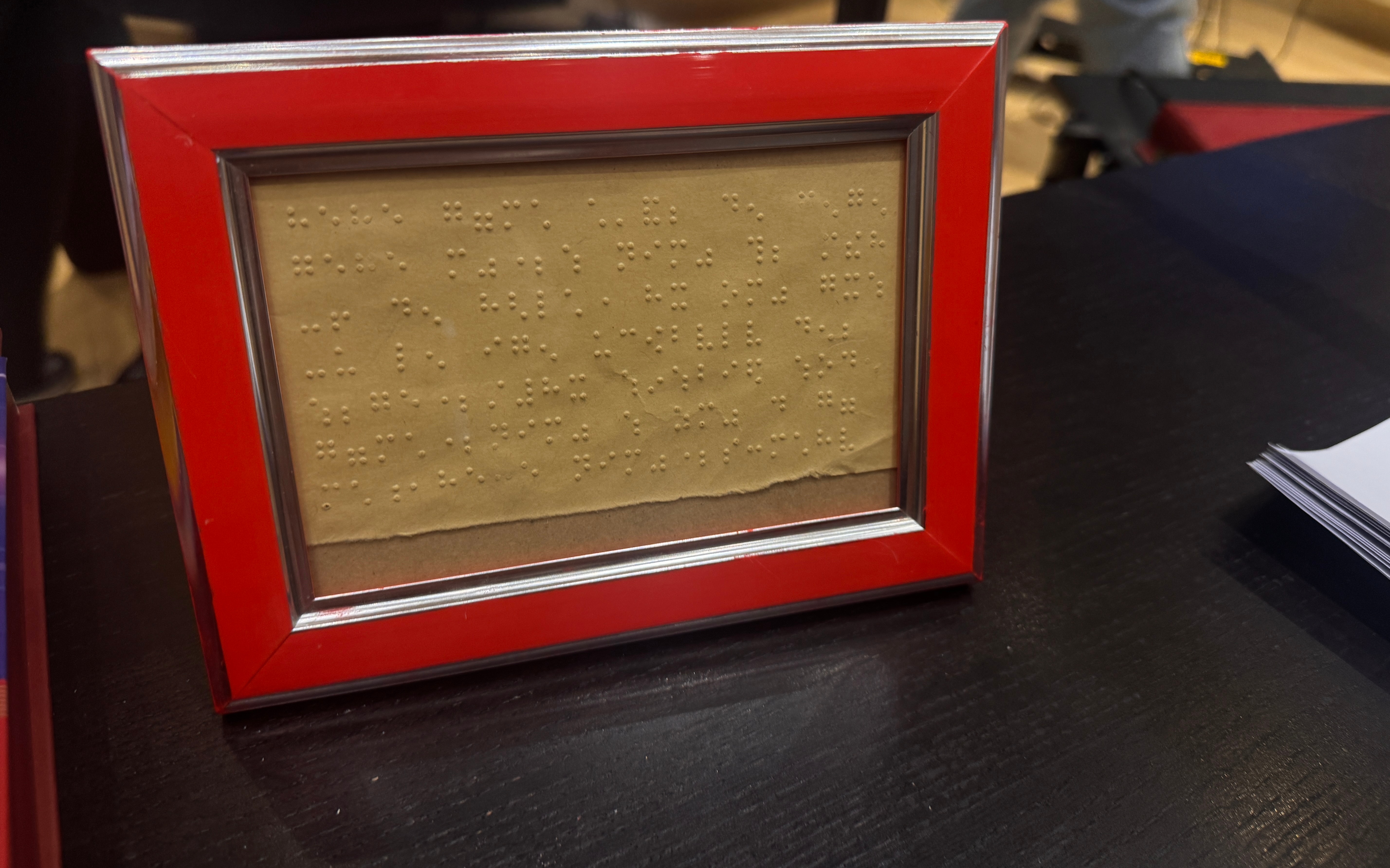 摆放在中国传媒大学“光明影院”录制室里的一份盲文感谢信。新京报记者 熊丽欣 摄