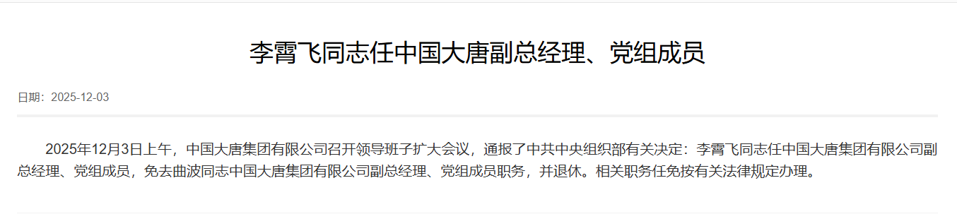 新京报讯 据中国大唐集团有限公司网站消息,2025年12月3日上午,中国大唐集团有限公司召开领导班子扩大会议,通报了中共中央组织部有关决定:李霄飞同志任中国大唐集团有限公司副总经理、党组成员,免去曲波同志中国大唐集团有限公司副总经理、党组成员职务,并退休。相关职务任免按有关法律规定办理。