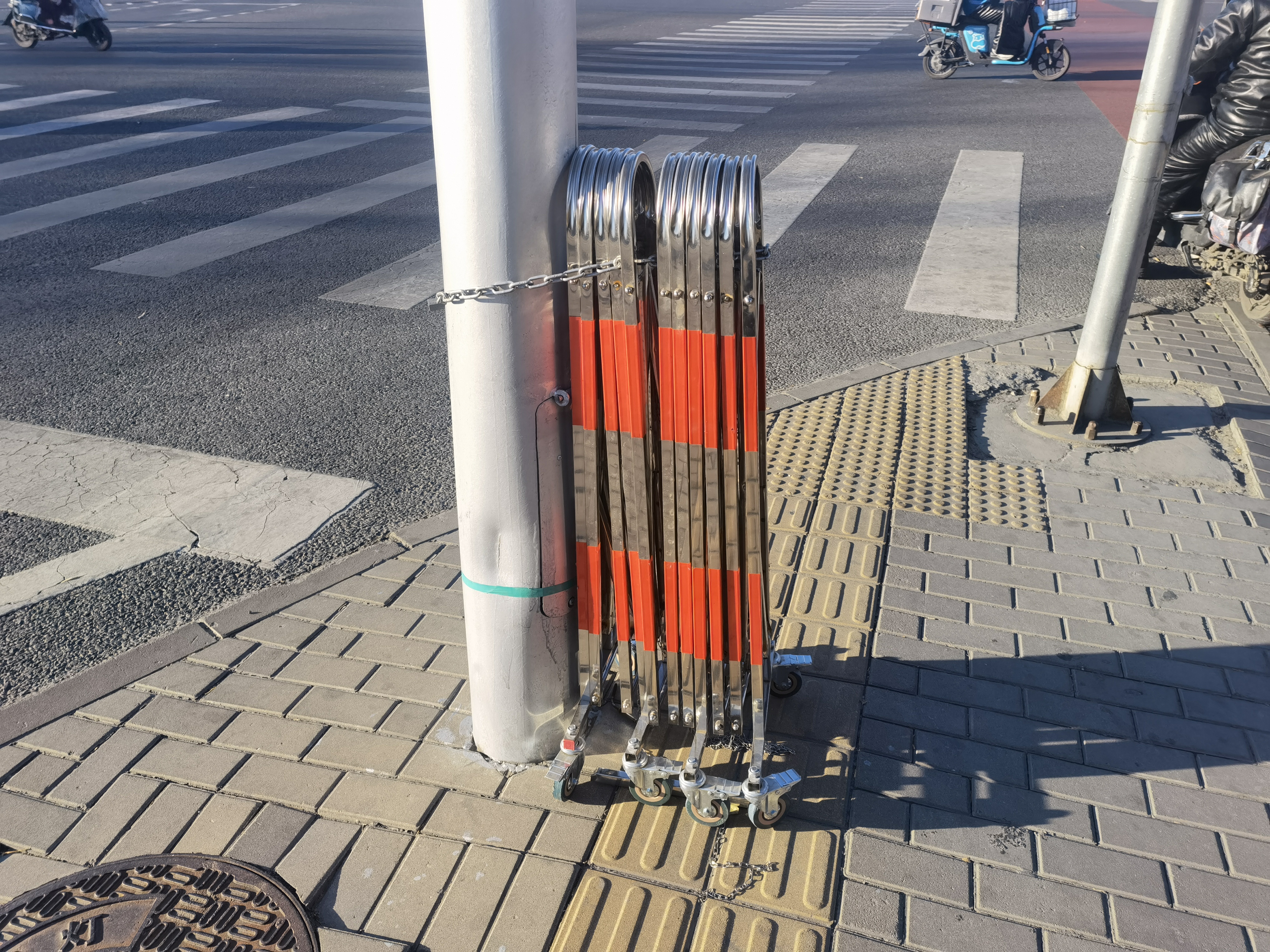 海淀区永丰路,盲道上的伸缩门。新京报记者 周怀宗 摄