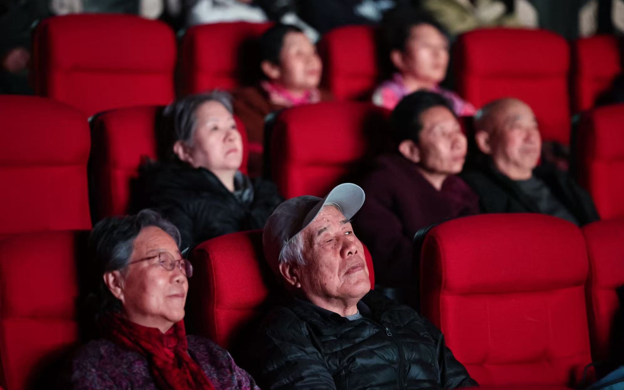 12月1日,黄新民和老伴儿坐在影院内,观看无障碍影片《热烈》。 新京报记者 王飞 摄
