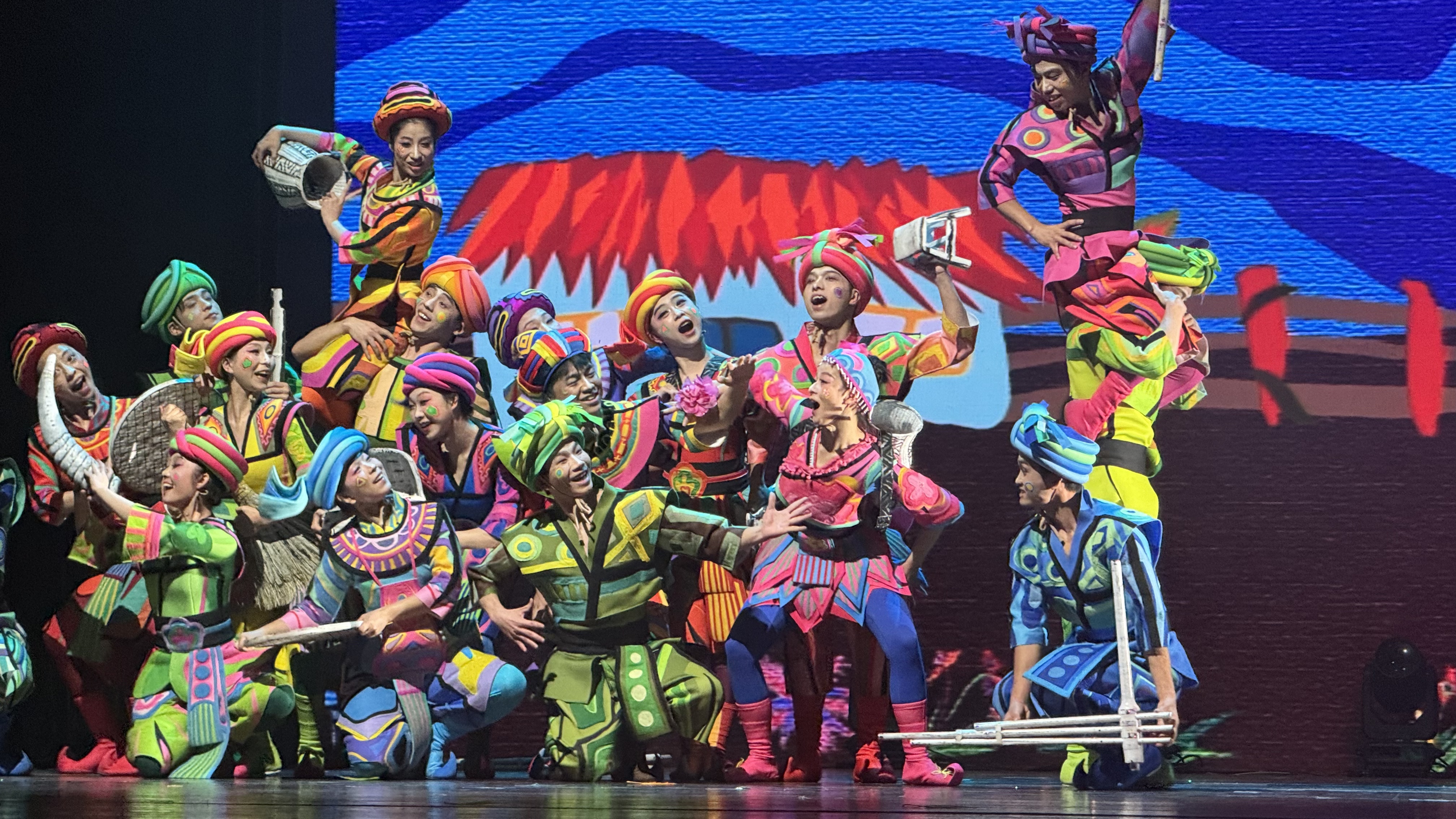 传统与现代的碰撞成为此次展演的一大亮点。布依八音《回家》以罗平村寨“猴群回归”为灵感,用牛骨胡、葫芦琴模拟自然之音,吟唱人与自然和谐共生的赞歌,夺得全国“群星奖”;迪庆州民族史诗歌舞剧《千年回响》以现代舞台重构千年故事,融入“香巴拉”传说,最终落脚于“人心相连、万物共生”的和谐愿景;德宏州《哦然未央》从景颇古歌中提取律动,融入当代审美;荣获“文华奖”的群舞《太平有象》以大象意象传递文化深意,引发现场持久掌声。压轴的广场舞《弹起弦子跳脚来》融合国家级非遗彝族左脚舞,将全场气氛推向高潮,其“全国群星奖”“彩云奖”双料冠军的荣誉实至名归。