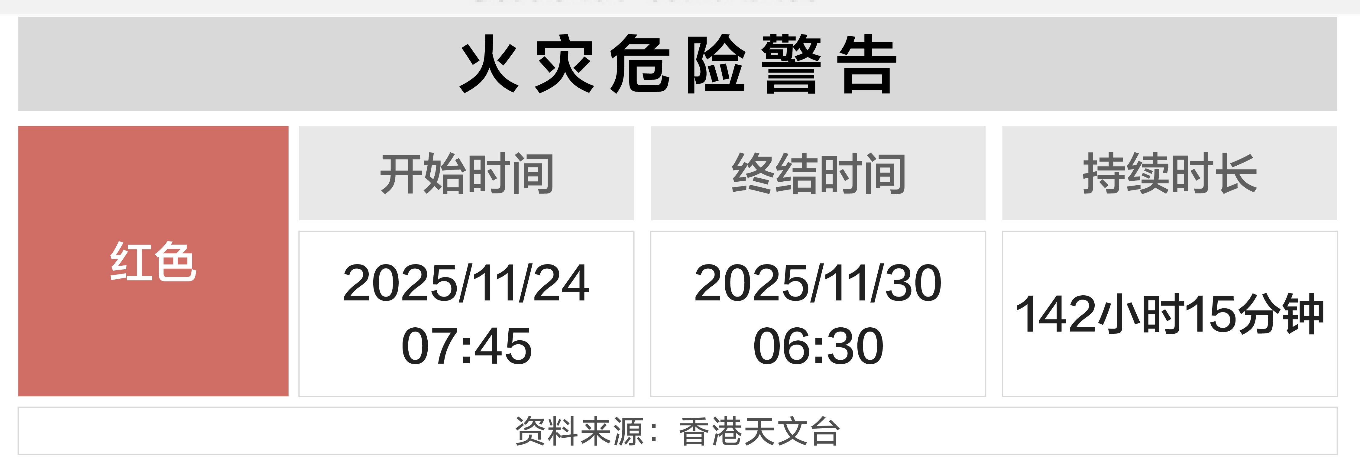 2025年11月24日早晨7:45,香港天文台发布了一则红色火灾危险警告,直到30日早晨6:30才解除,这是香港进入11月以来持续时间最长的一次红色警告。