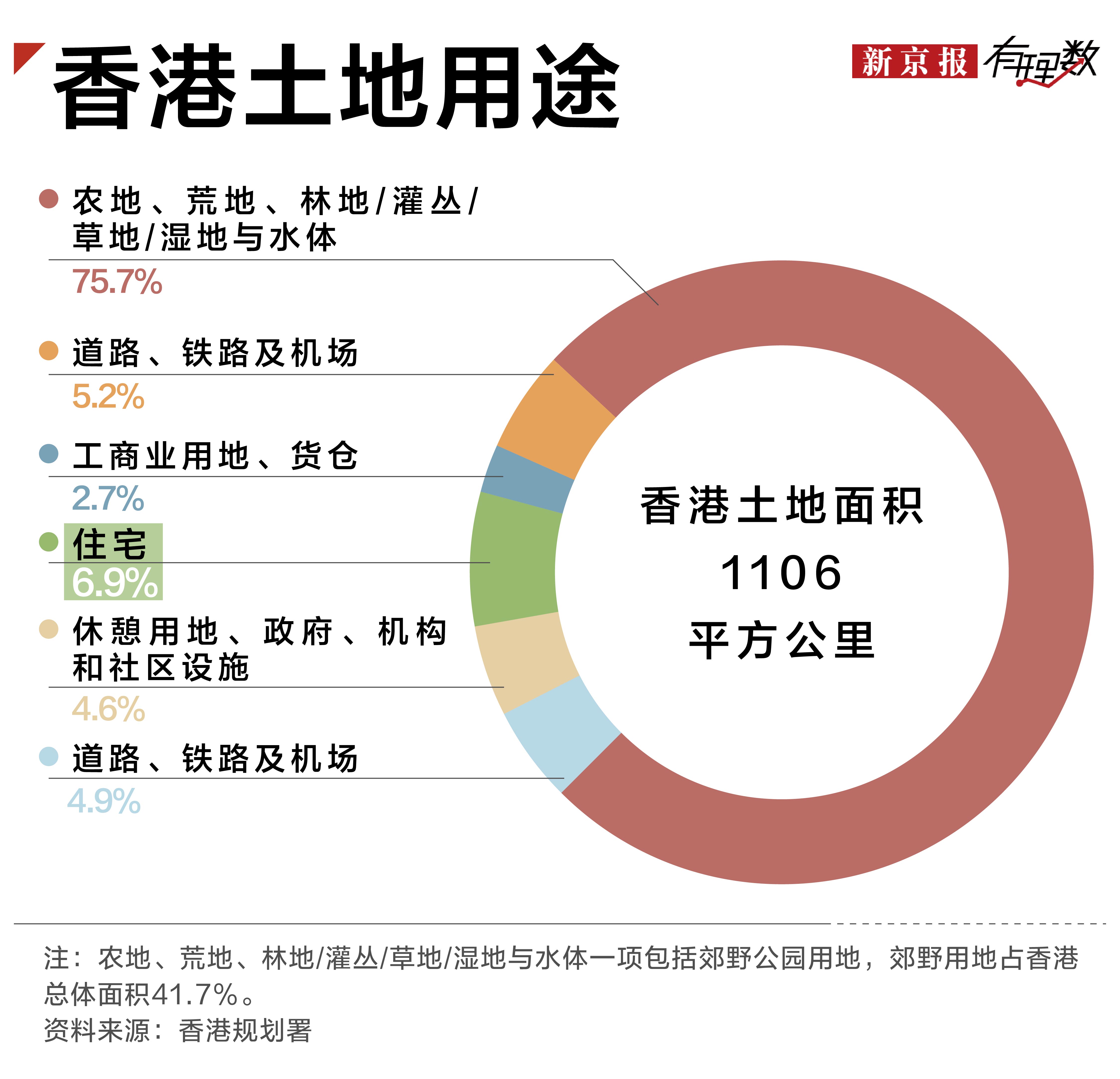 同时,受港英时期确立的郊野公园制度影响,大量土地被锁定,香港的土地面积中,郊野公园和自然保护区占了四成,而用作住宅用途的土地则只占整体土地6.9%。
