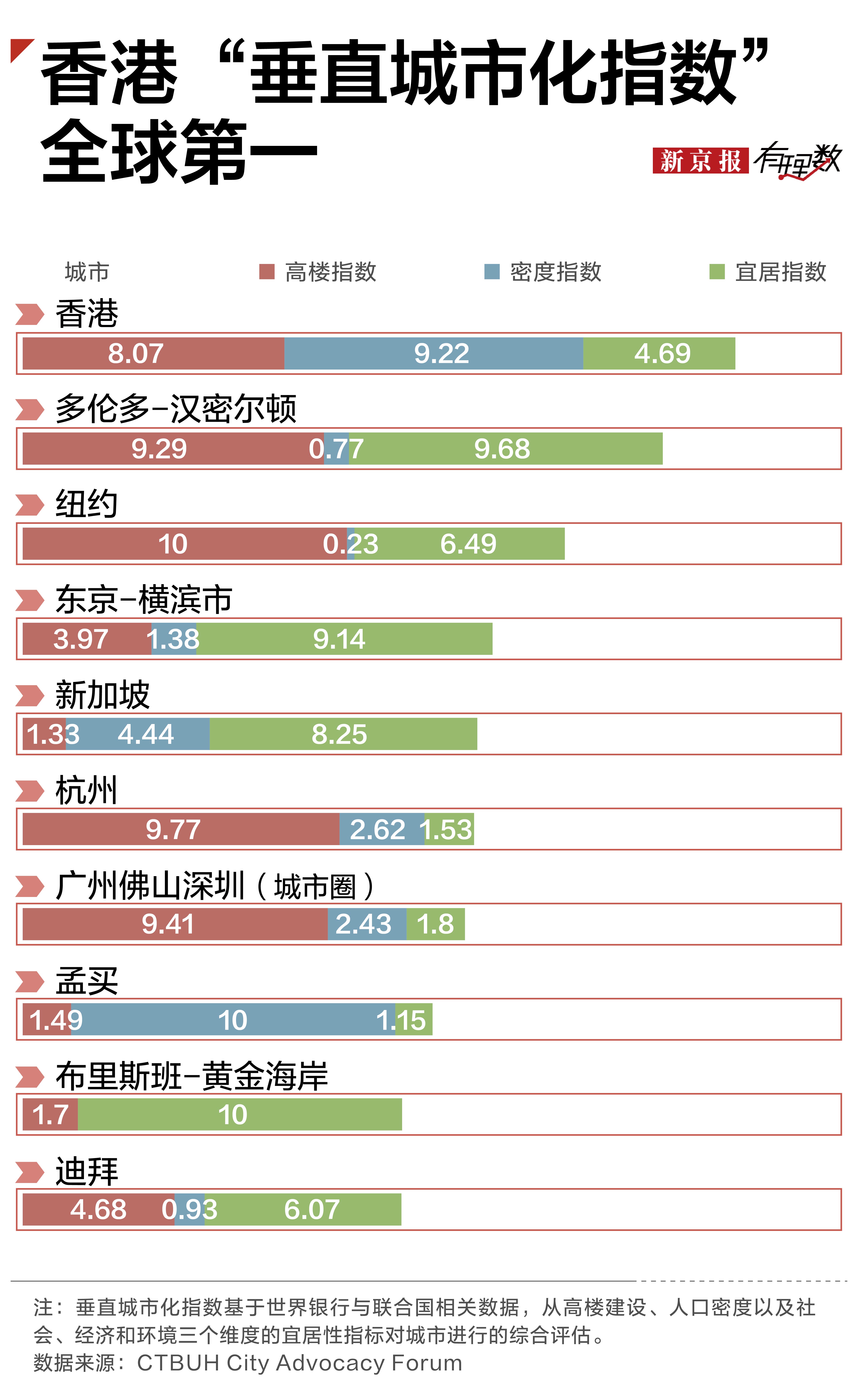 庞大的城市人口,有限的土地面积,香港的建筑不仅高,间距还小。在CTBUH城市倡导论坛研究的全球40多个城市群中,香港的高层建筑密度指数9.22,仅次于孟买。高度和密度指数结合起来,香港全球第一。