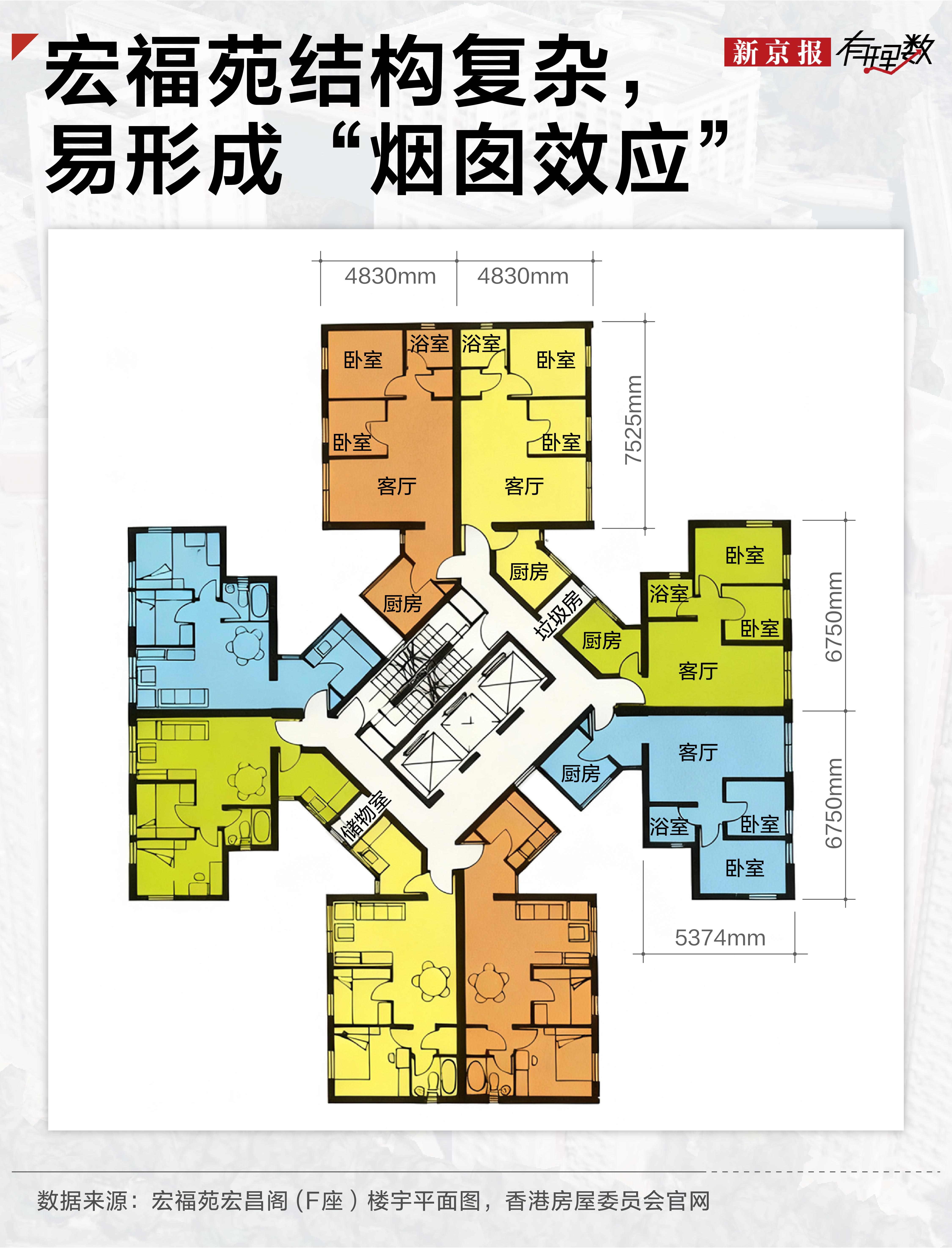 不但外面拥挤,内部结构也是极致利用。据资料显示,宏福苑小区大楼内部结构利用情况复杂,在起火后,被四面房子环绕的楼梯间、管道井等形成巨大垂直通道,强化了“烟囱效应”,让火势在短时间内迅速波及高层,形成内外夹攻之势。