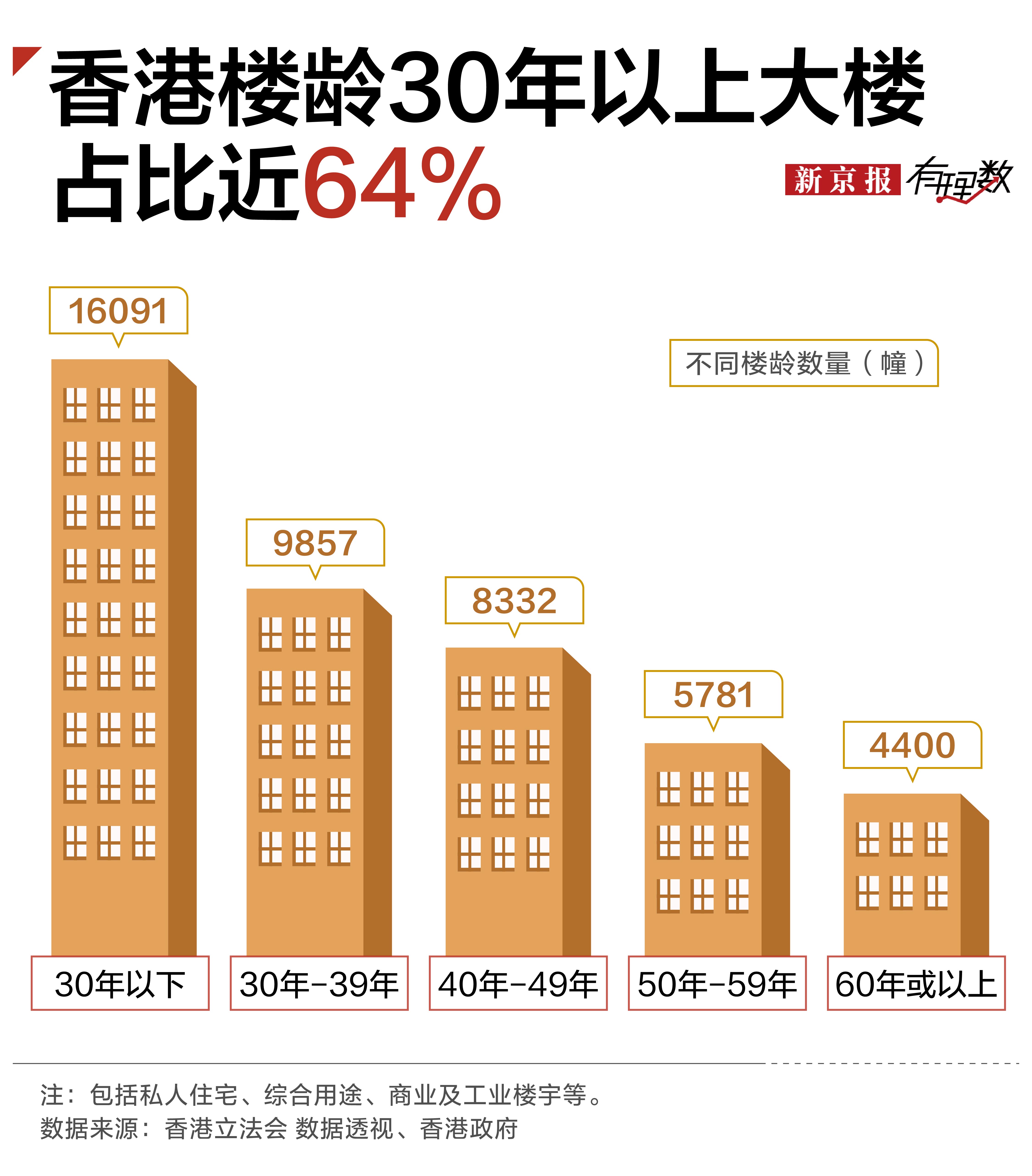根据香港立法会秘书处数据,截至2023年底,香港有近3万幢大厦楼龄超过30年,占总数约64%,属于强制验楼范围,而达到该龄的楼宇的数目每年仍在快速递增。