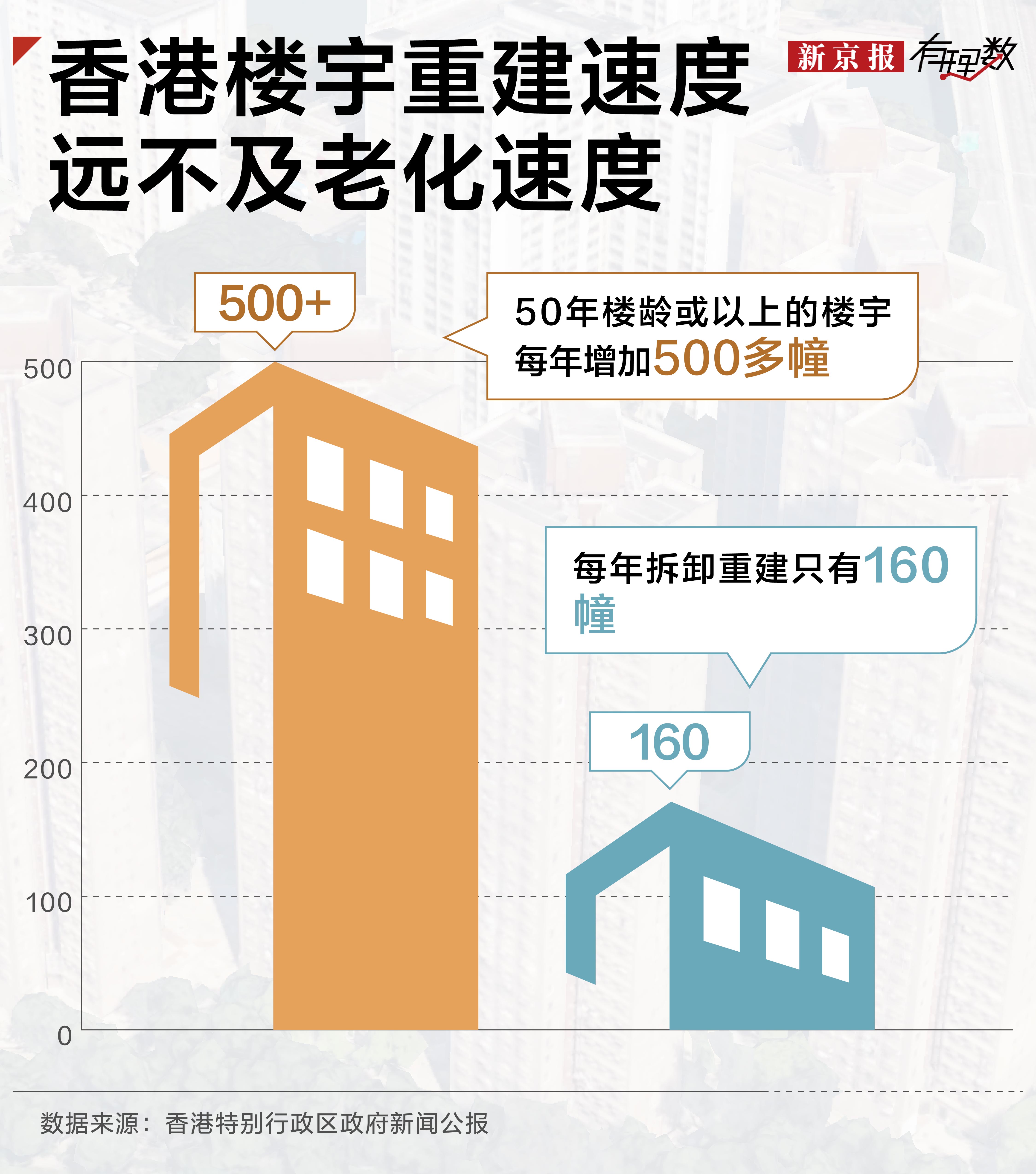 香港当地的数据显示,过去十年,50年楼龄或以上的楼宇每年增加500多幢,但拆卸重建的只有160幢。