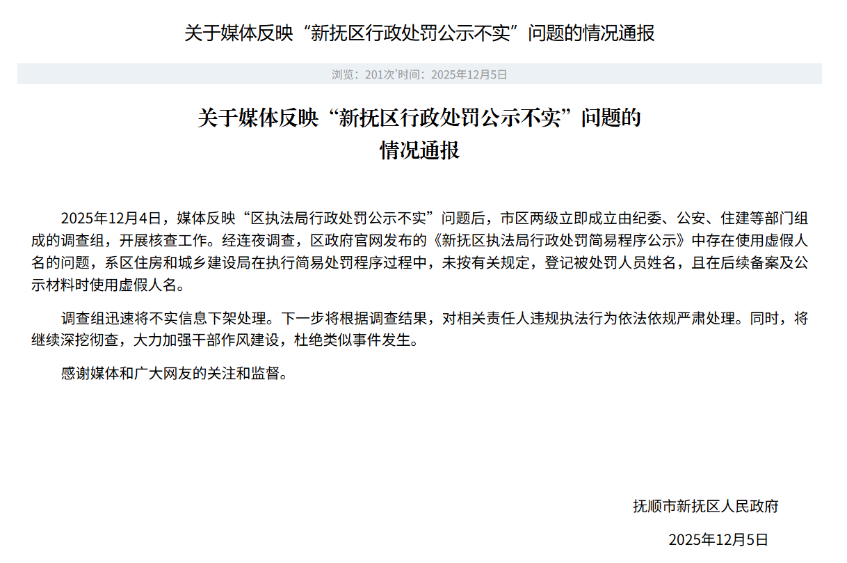 2025年12月4日,媒体反映“区执法局行政处罚公示不实”问题后,市区两级立即成立由纪委、公安、住建等部门组成的调查组,开展核查工作。经连夜调查,区政府官网发布的《新抚区执法局行政处罚简易程序公示》中存在使用虚假人名的问题,系区住房和城乡建设局在执行简易处罚程序过程中,未按有关规定,登记被处罚人员姓名,且在后续备案及公示材料时使用虚假人名。