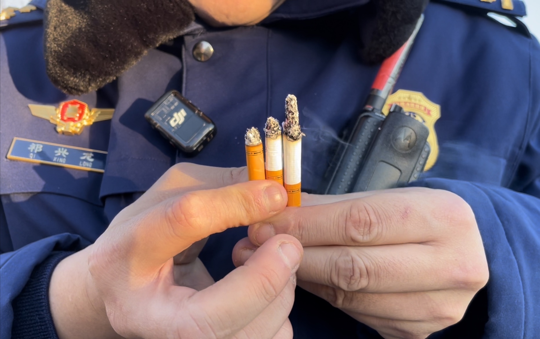 消防员从36米高空依次扔下的3支点燃的香烟,落地后依旧着着。新京报记者 张静姝 摄
