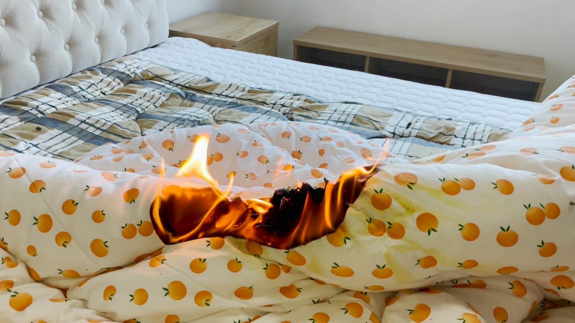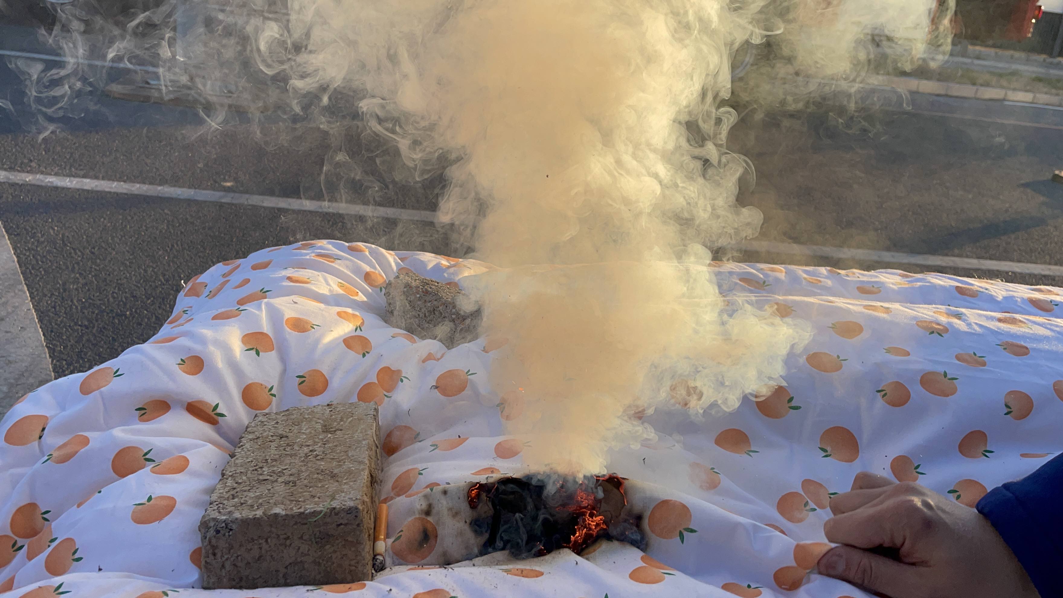 12月3日,在一间居民楼的卧室里,祁兴龙做了这样一起模拟实验。一个点燃的烟头“无意”间落在床铺的棉被上。祁兴龙一个翻身,将烟头裹进棉被,屋内看上去平静如常。