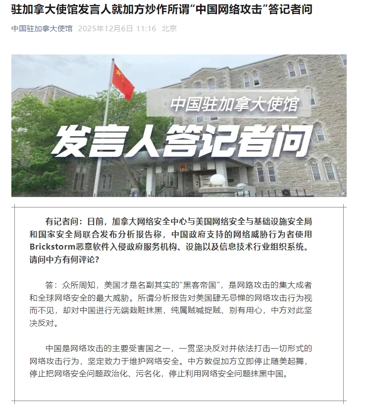 中国驻加拿大使馆发言人就加方炒作所谓“中国网络攻击”答记者问