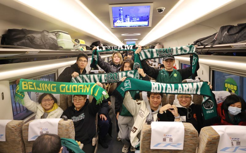 球迷乘坐G115次列车。国铁北京局对列车车厢进行了主题装饰,并贴心准备了现磨“争气咖啡”等热饮。