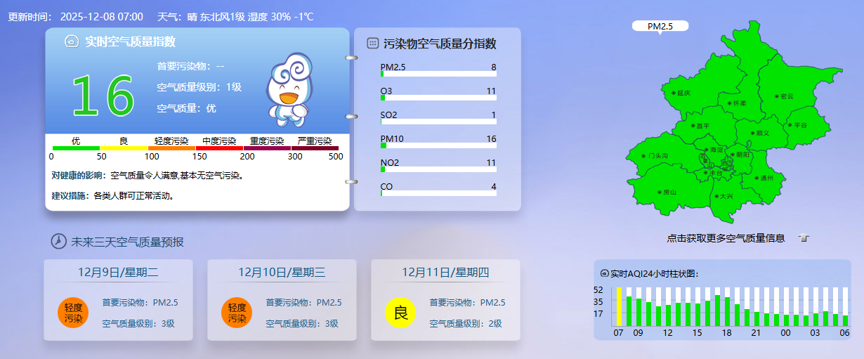 据北京市生态环境监测中心今早7时数据,目前实时空气质量指数16,空气质量优。
