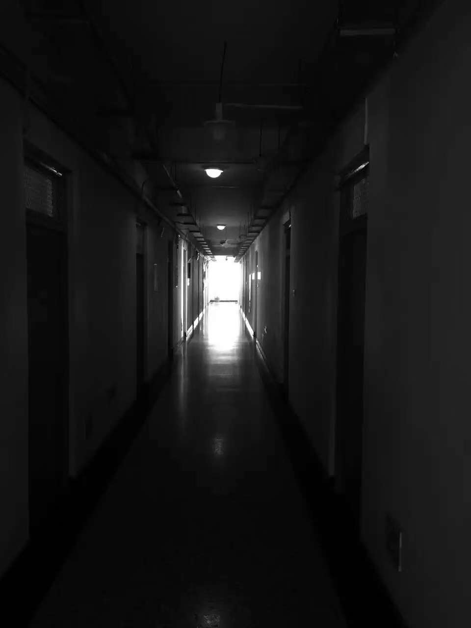 2016年1月期末考试后,小月在夜晚拍了一张宿舍楼道的照片。她觉得这象征着自己的内心世界,被黑暗充斥,不知道什么时候才能走到光明的地方。受访者供图