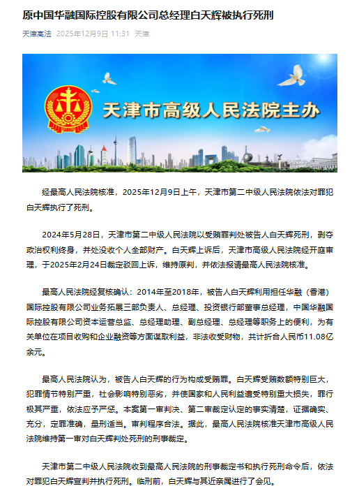 新京报讯 据天津高院消息,经最高人民法院核准,2025年12月9日上午,天津市第二中级人民法院依法对罪犯白天辉执行了死刑。