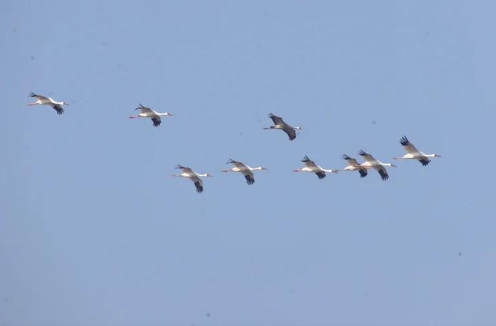 记者了解到,北京地区共分布七种鹤类,分别是白枕鹤、灰鹤、白头鹤、白鹤、丹顶鹤、蓑羽鹤和沙丘鹤。近年来,体型优雅的白鹤频频在北京现身。2022年3月,17只白鹤在南海子公园上空翱翔。2023年3月,5只白鹤曾在密云水库北岸落脚歇息。