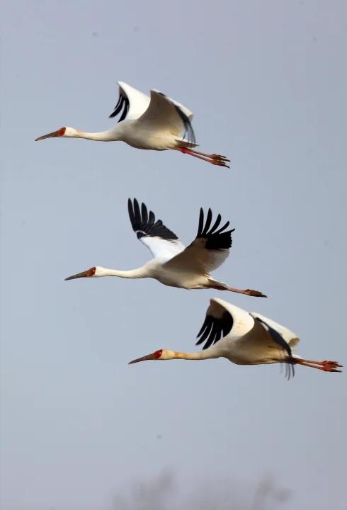 李理说,白鹤通身羽毛洁白,只有翅的前端(初级飞羽)为黑色,故又称“黑袖鹤”。白鹤是一种长寿鸟类,在自然界中能够存活五六十年,在中国传统文化中代表着祥瑞和长寿。它们平时喜欢吃水生植物的块状根茎,也吃草籽和软体动物。白鹤数量最少时,全球只有不足4000只。白鹤是湿地生态系统的“旗舰物种”,迁徙路线横跨欧亚大陆,它们主要在西伯利亚繁殖,在我国鄱阳湖越冬。