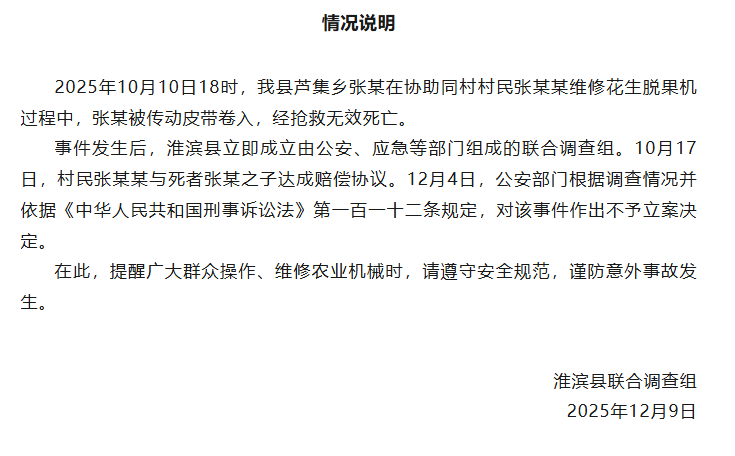新京报讯 12月9日,淮滨县联合调查组发布情况说明:2025年10月10日18时,该县芦集乡张某在协助同村村民张某某维修花生脱果机过程中,张某被传动皮带卷入,经抢救无效死亡。