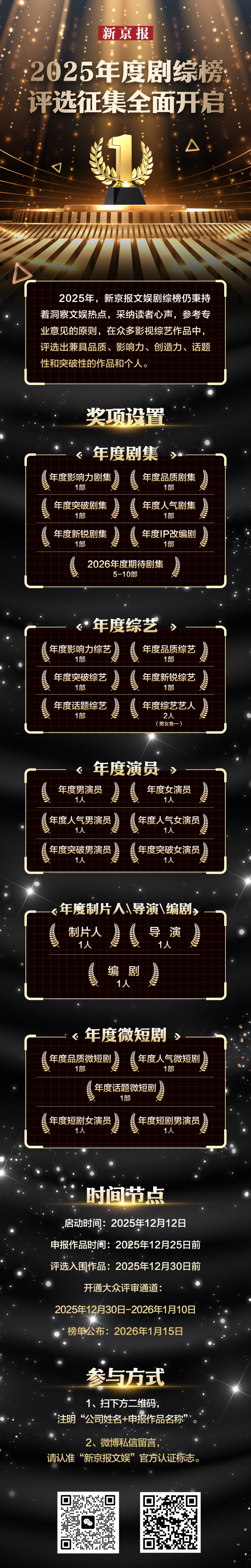 新京报文娱秉持“洞察文娱热点”“采纳读者心声”“参考专业意见”原则,在众多剧集综艺作品中,将评出兼具品质、影响力、创造力、话题性和突破性的作品和个人。现全面开启评选征集活动,结果将在“新京报2025年剧集榜”和“新京报2025年综艺榜”两大榜单中公示。