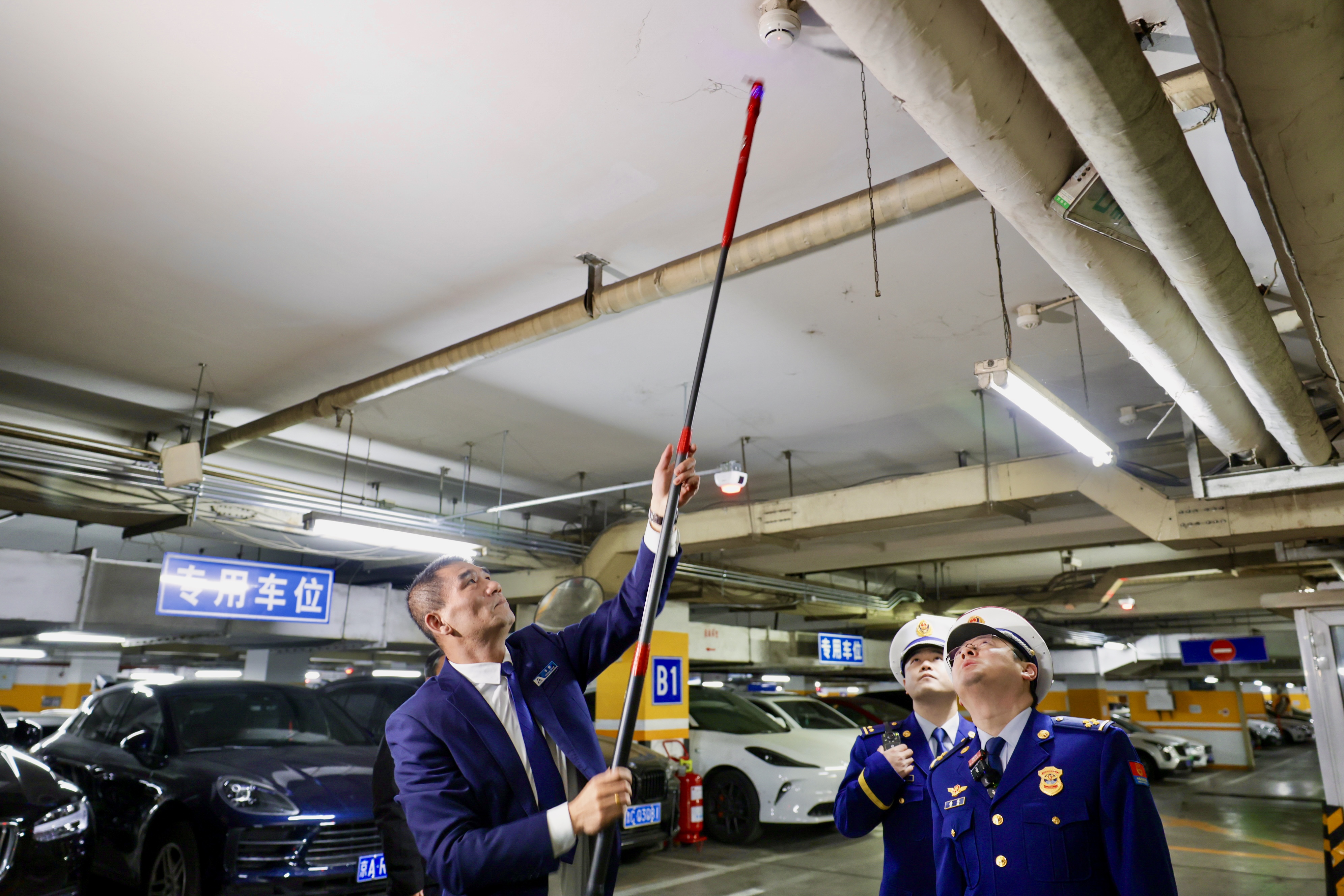检查中,物业工作人员用烟感、温感测试仪伸到位于地下车库顶部的报警器底下,几秒钟后,报警器红灯亮起,几乎是同一时间,物业中控室的消防系统响起警报,屏幕上显示了工作中的报警器位置和编号。中控室里,魏然按照“双人24小时值班值守”的要求,查看了两人的职业资格证书,并问询应急处置流程。之后,魏然又先后检查了消防泵房、墙壁消火栓等涉及消防水系统的设施设备,现场督促物业工作人员清理了墙壁消火栓下方放着的水桶和垃圾桶。