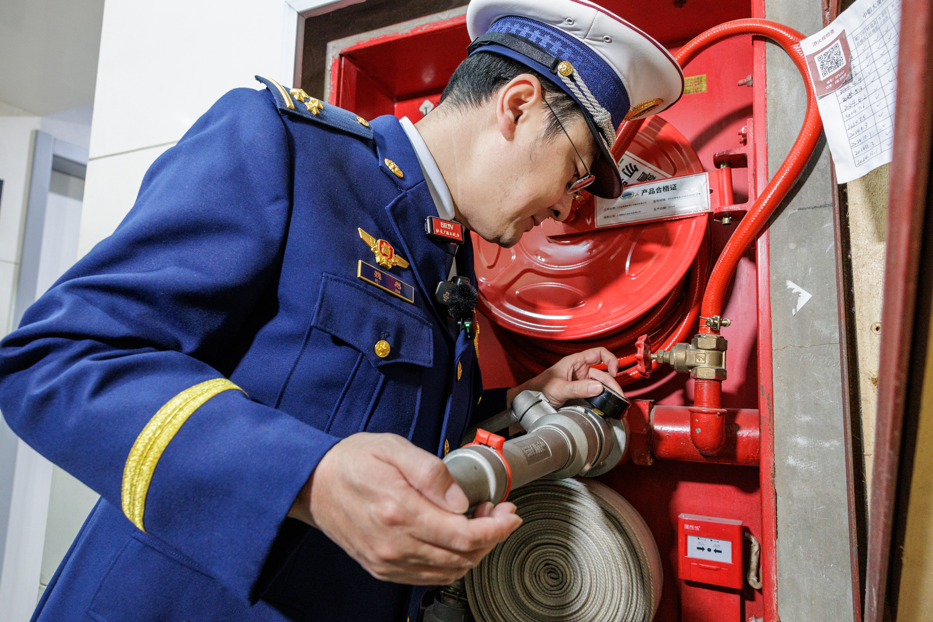 魏然在检查消火栓压力。新京报记者 王子诚 摄