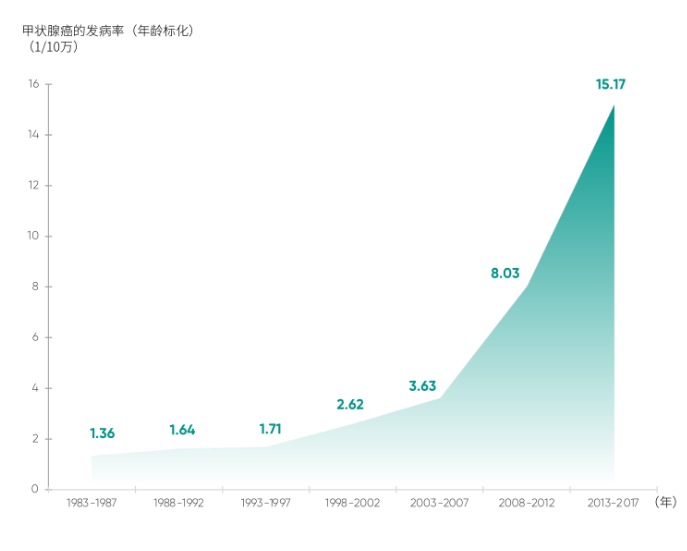 2024年,四川大学发布的一篇文章分析了1983年至2017年间中国32种癌症的发病趋势及其变化,研究结果显示,在所有分析的癌症中,甲状腺癌的发病率(年龄标化)增幅最高。预测显示,从2018年至2032年,甲状腺癌的发病率(年龄标化)将继续呈现增长趋势。