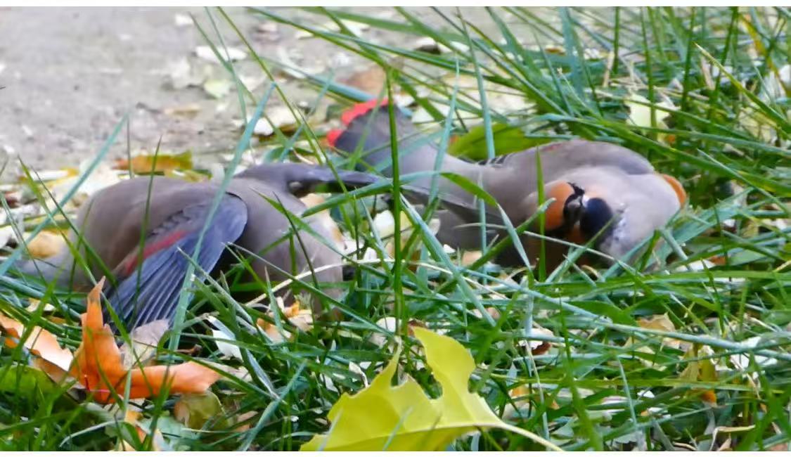 11月29日,撞到玻璃后,两只小太平鸟跌在草坪上。受访者供图
