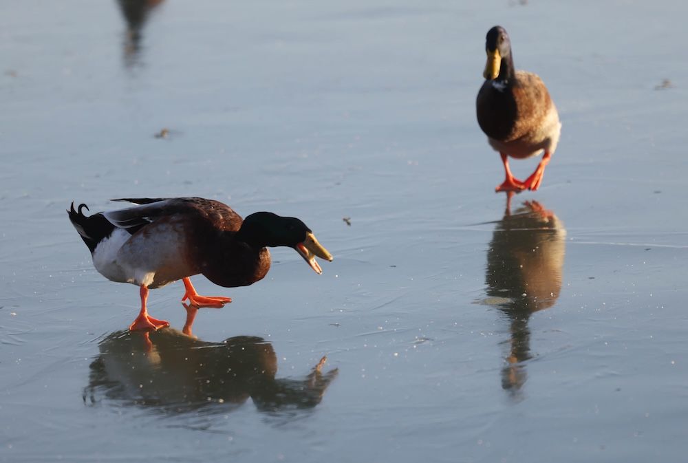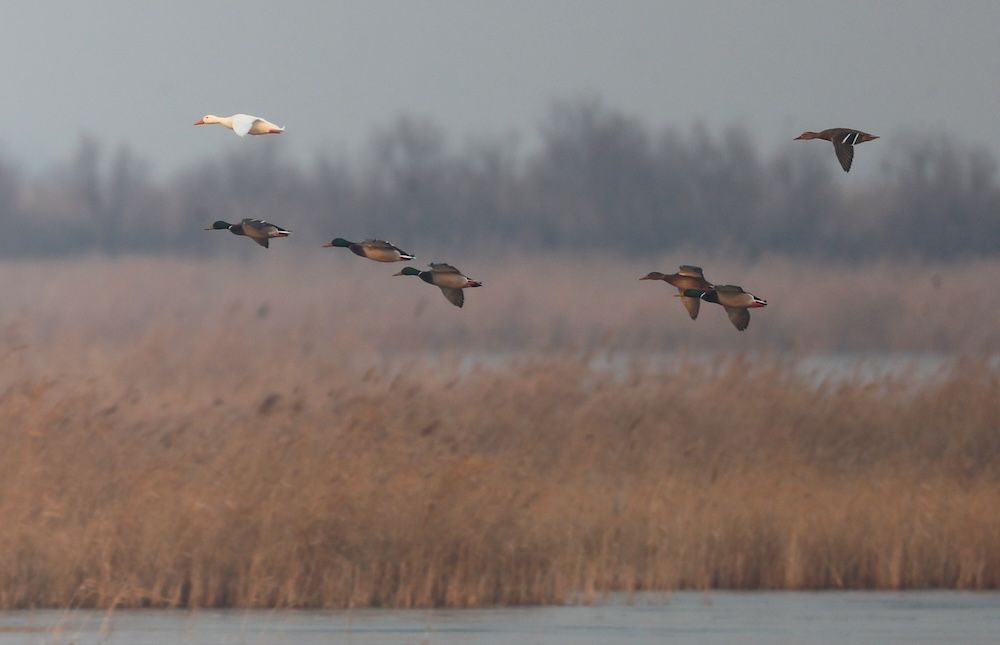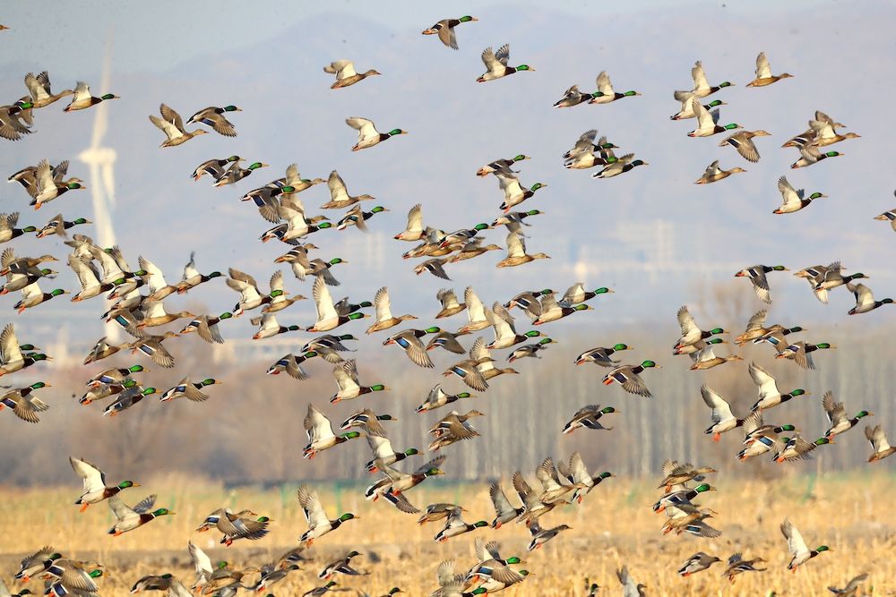 2025年3月,官厅水库区域,家鸭与绿头鸭一同迁徙。