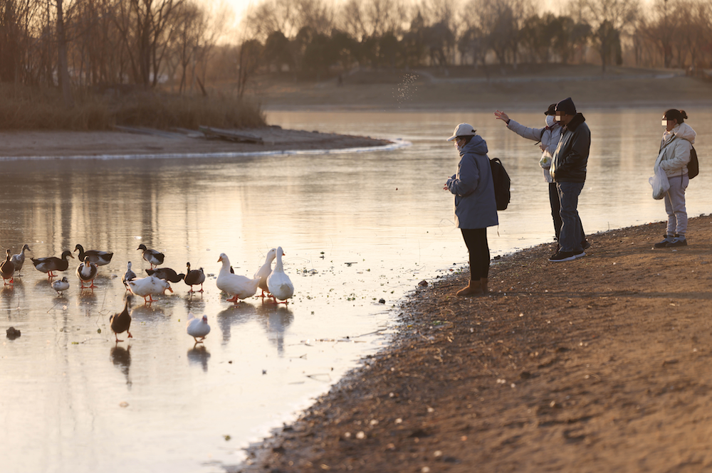 12月10日,奥林匹克森林公园,市民在向鸿雁、斑头雁投喂馒头。