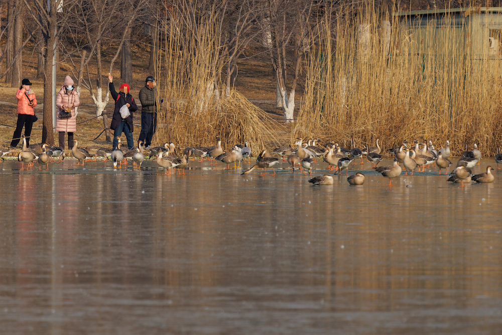 12月10日上午10时,奥林匹克森林公园已经结冰的湖面上还停留着鸿雁、斑头雁、绿头鸭等许多野生鸟类。不远处的岸边,围着许多观赏它们的游客。其中,有的游客带着孩子,提着装满食物的塑料袋子,专门前来进行投喂。
