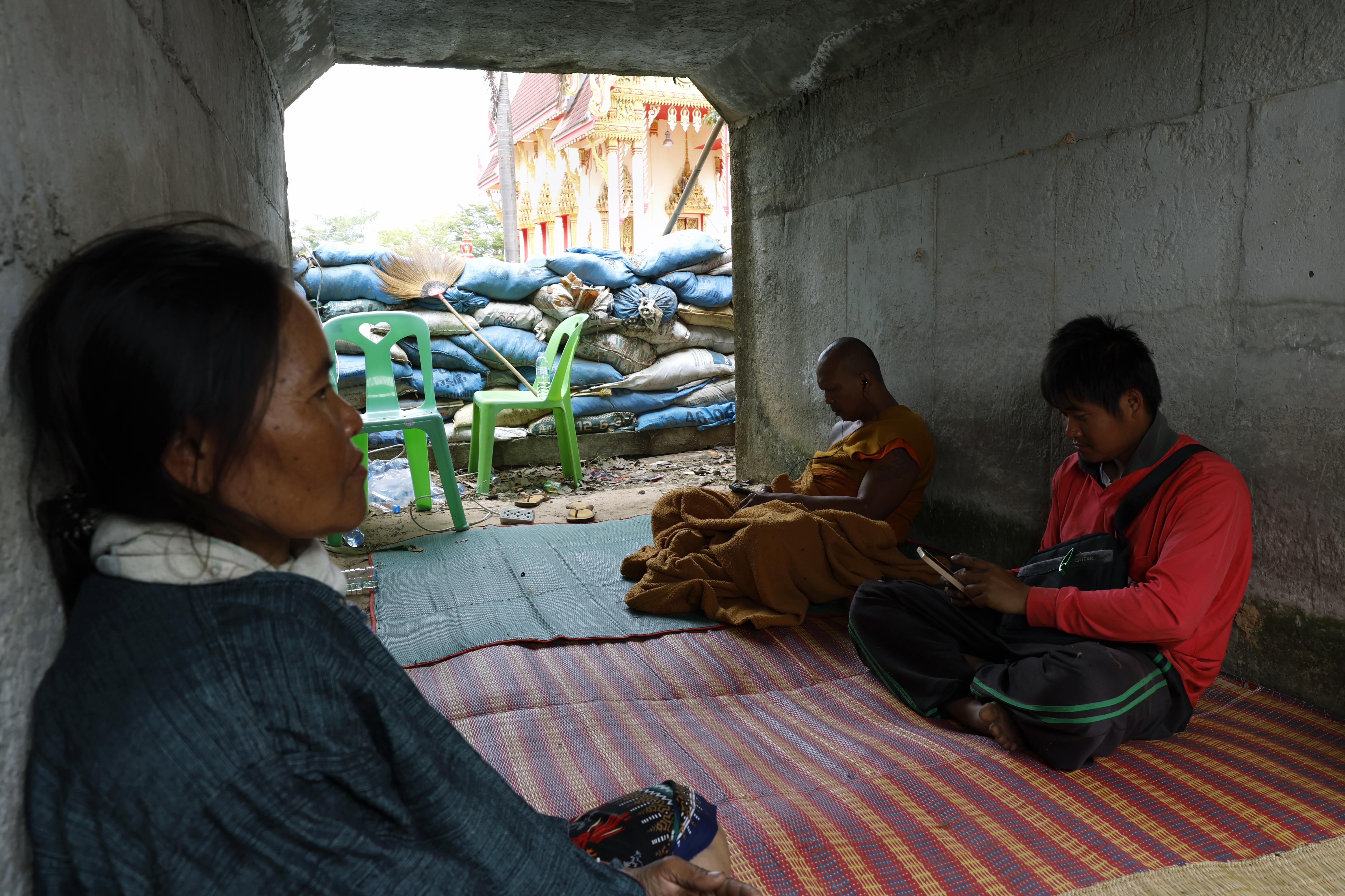 当地时间2025年12月10日,泰国素林府,泰柬边境冲突持续,村民和僧侣在掩体中避难。图/IC photo