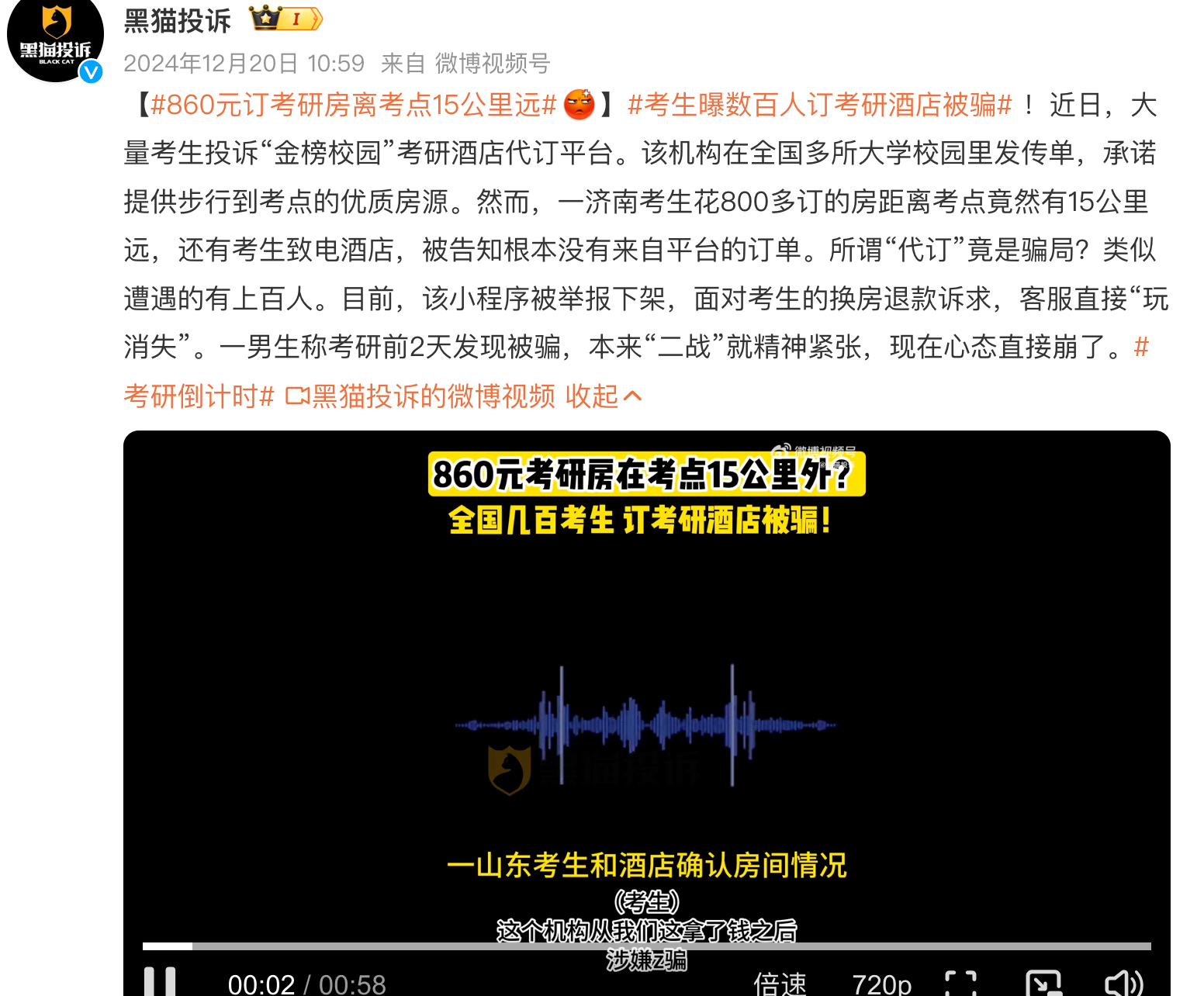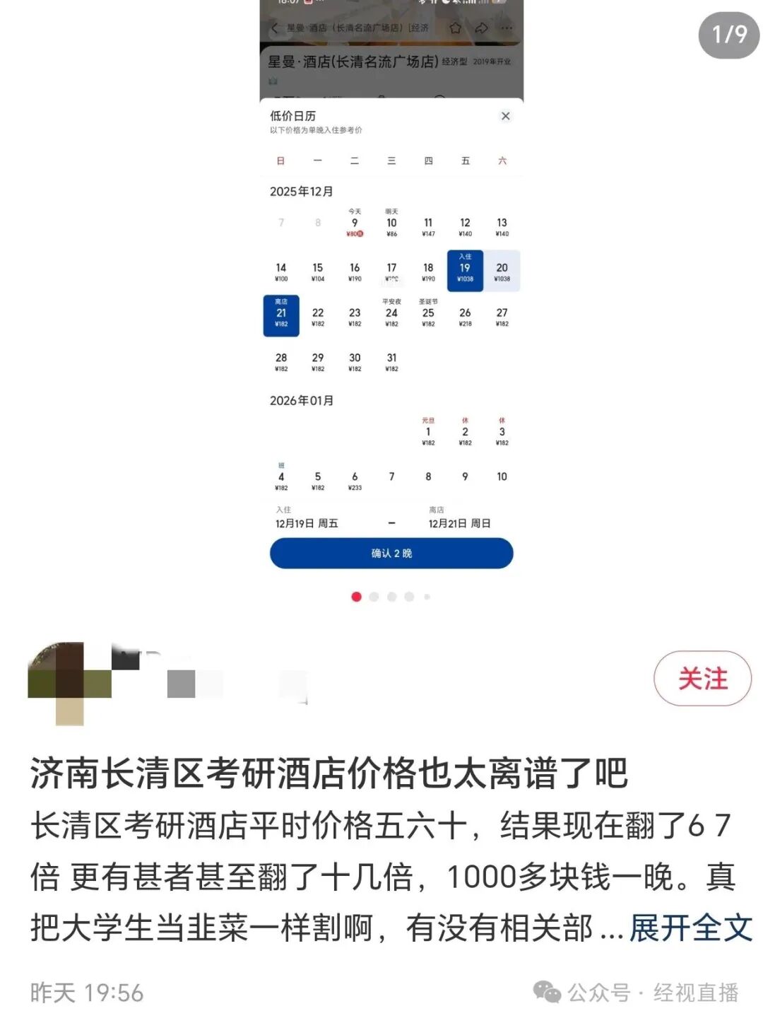 有网友在社交平台发文称,济南市长清区考研点附近的酒店价格在考试期间暴涨数倍,部分酒店单晚价格甚至突破千元大关。