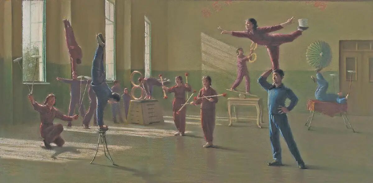 李尤松的创作正是这股当代潮流中颇具个人色彩与本土思考的实践。他的作品往往穿梭于历史记忆、个人经历与文化想象之间,构建出独特的视觉叙事世界。其中,《曼哈顿的中国杂技》是他最具代表性的作品之一。这部作品的创作种子,深植于他独特的童年经验。父亲作为杂技团乐队指挥的身份,让舞台、音乐、排练场景成为他儿时日常的一部分。家中那台播放着交响乐的黑胶唱机,与父亲从美国演出带回的一盒“555”牌香烟,分别成为他接触西方“高雅艺术”与“流行文化”的最初符号。