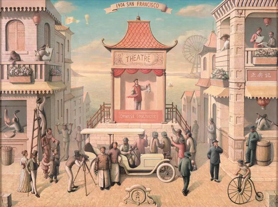这些碎片化的记忆——东方的、西方的、传统的、现代的、听觉的、视觉的——在他的艺术思维中发酵、融合,最终生长成一个充满超现实色彩的梦境:在曼哈顿摩天楼的映衬下,一个中国杂技团正在上演古老的戏法。这并非简单的文化拼贴,而是一种基于个人真实情感的文化遐想,是“一个中国民间杂技被置入了曼哈顿的都市环境”中所产生的奇妙化学反应。