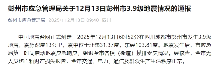 新京报讯 据彭州市应急管理局消息,中国地震台网正式测定,2025年12月13日6时52分在四川成都市彭州市发生3.9级地震,震源深度13公里,震中位于北纬31.37度,东经103.81度。地震发生后,市应急局第一时间启动地震应急响应,组织全市各镇(街道)摸排受灾情况。经核查,全市无人员伤亡和财产损失报告,全市交通、电力、通信及群众生产生活秩序正常。
