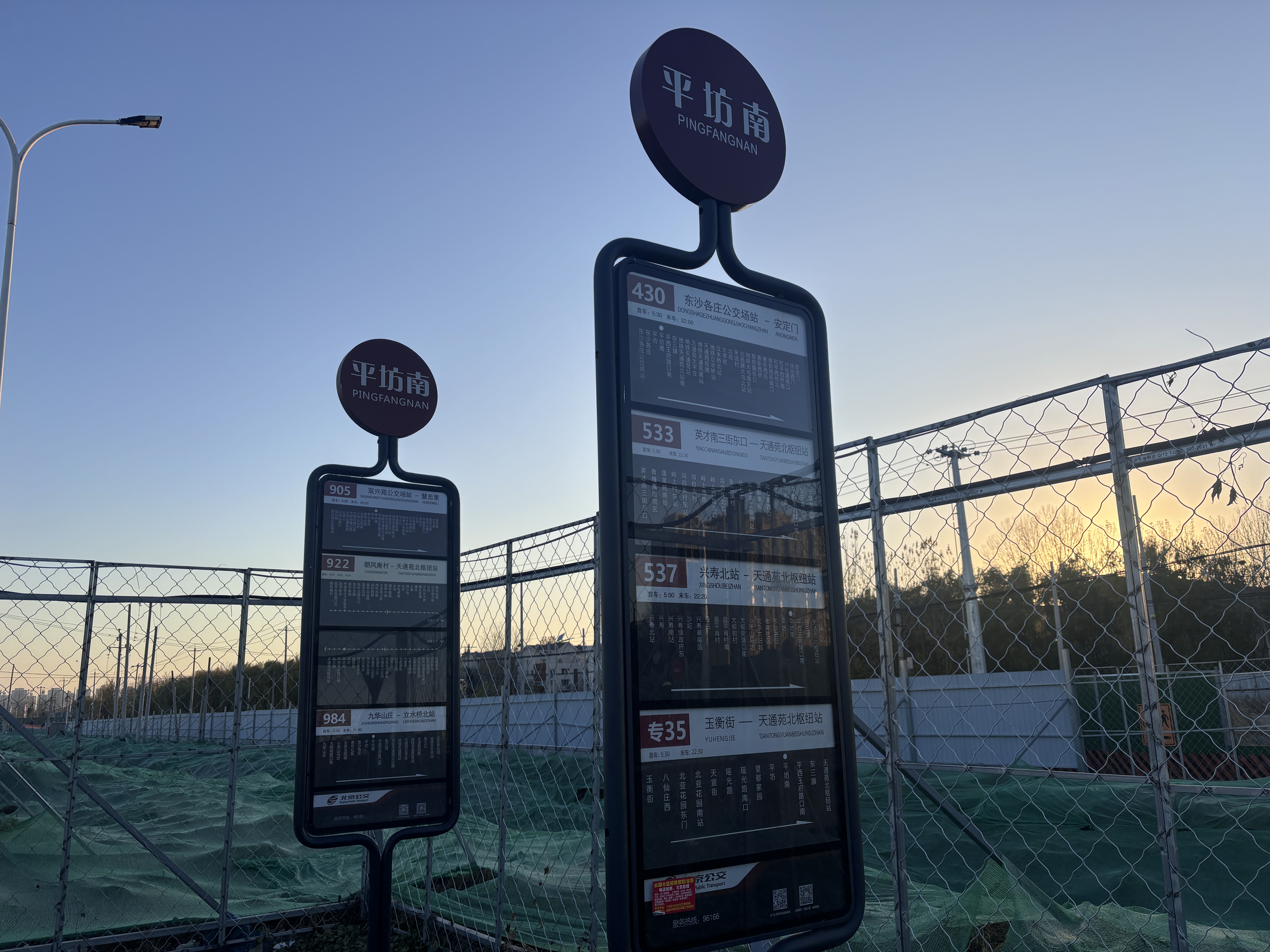 记者来到市民所说的立汤路平坊南公交站附近,看到周围正在进行大面积施工,大路两侧被大范围的围挡封住。由于施工,西侧临时的平坊南公交站略显简陋,没有顶棚,只有两个孤零零的站牌立着,上面显示有昌27、C110、905、922、984、643等12条公交线路经过。两侧有辅路,上面有人和非机动车并行的标志。