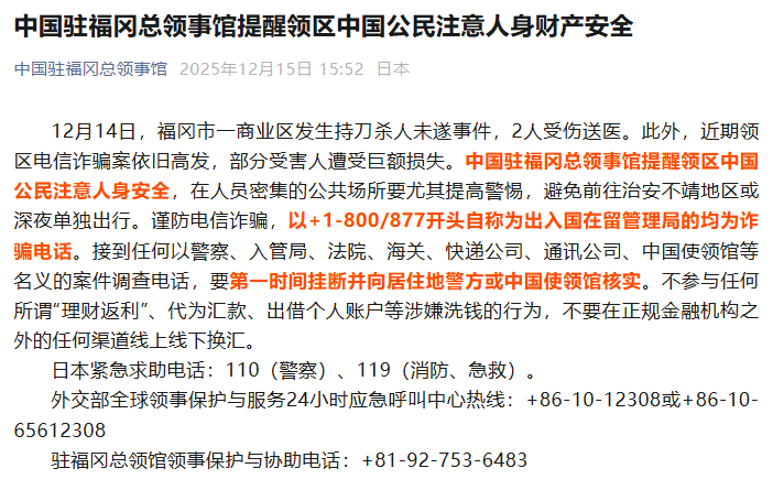 新京报讯 据中国驻福冈总领事馆微信公众号消息,12月14日,福冈市一商业区发生持刀杀人未遂事件,2人受伤送医。此外,近期领区电信诈骗案依旧高发,部分受害人遭受巨额损失。中国驻福冈总领事馆提醒领区中国公民注意人身安全,在人员密集的公共场所要尤其提高警惕,避免前往治安不靖地区或深夜单独出行。谨防电信诈骗,以+1-800/877开头自称为出入国在留管理局的均为诈骗电话。接到任何以警察、入管局、法院、海关、快递公司、通讯公司、中国使领馆等名义的案件调查电话,要第一时间挂断并向居住地警方或中国使领馆核实。不参与任何所谓“理财返利”、代为汇款、出借个人账户等涉嫌洗钱的行为,不要在正规金融机构之外的任何渠道线上线下换汇。